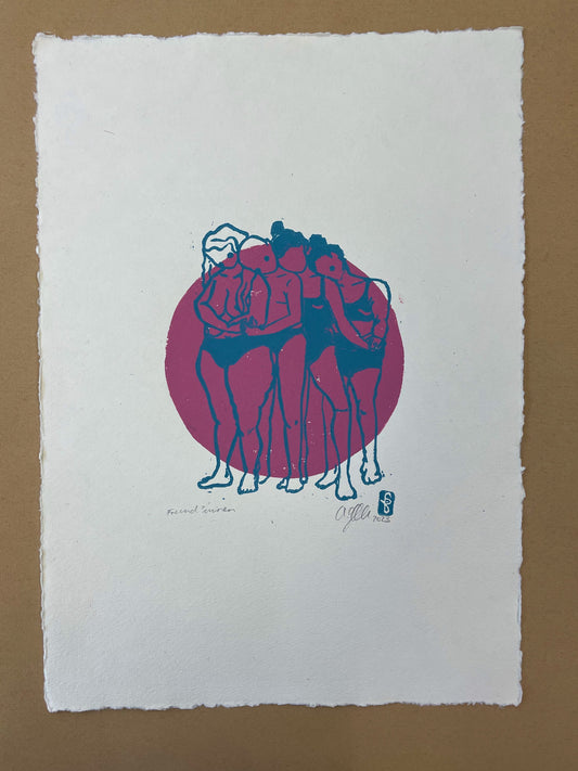 Freund*innen Original Linoldruck Magenta / Petrol