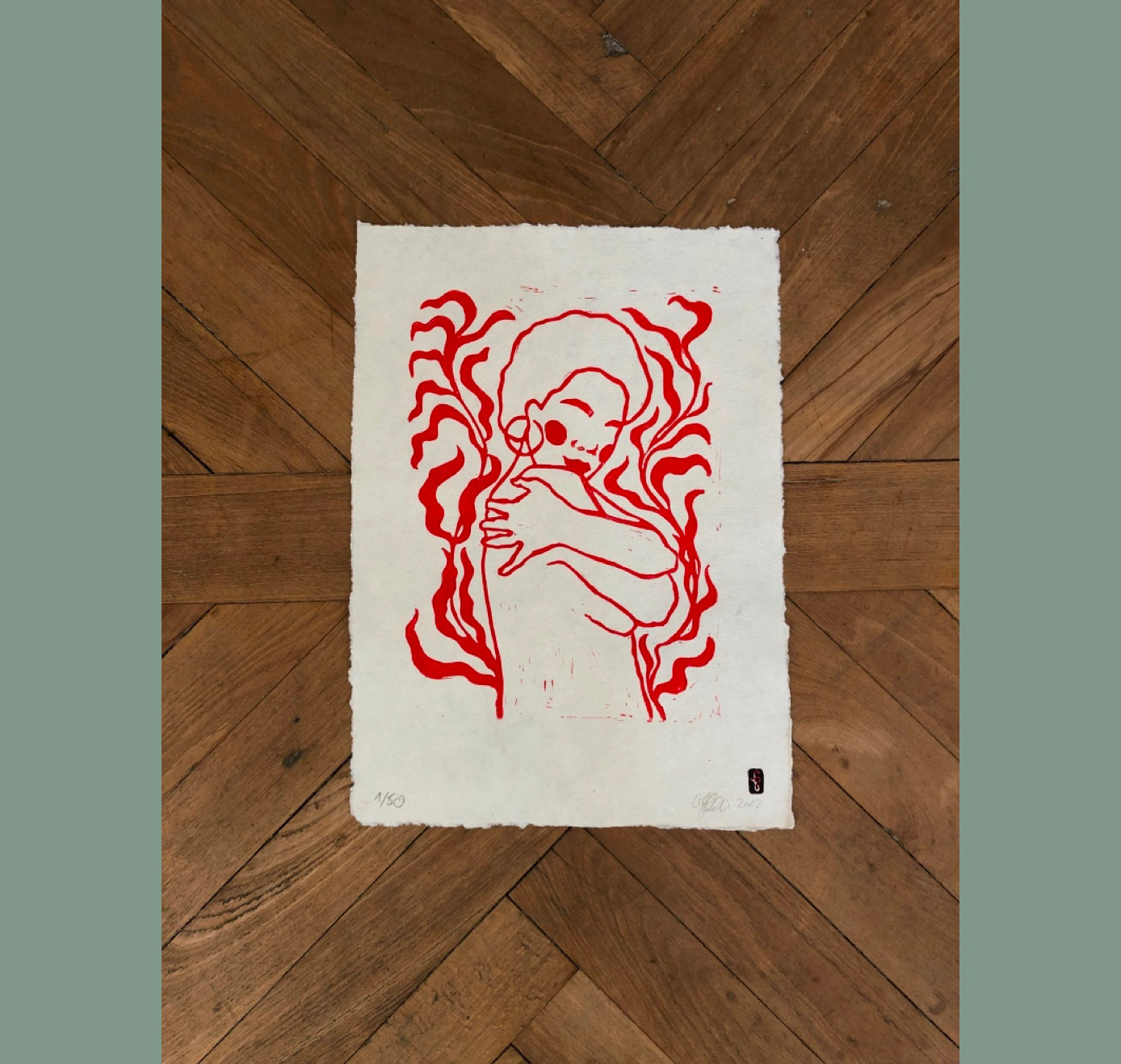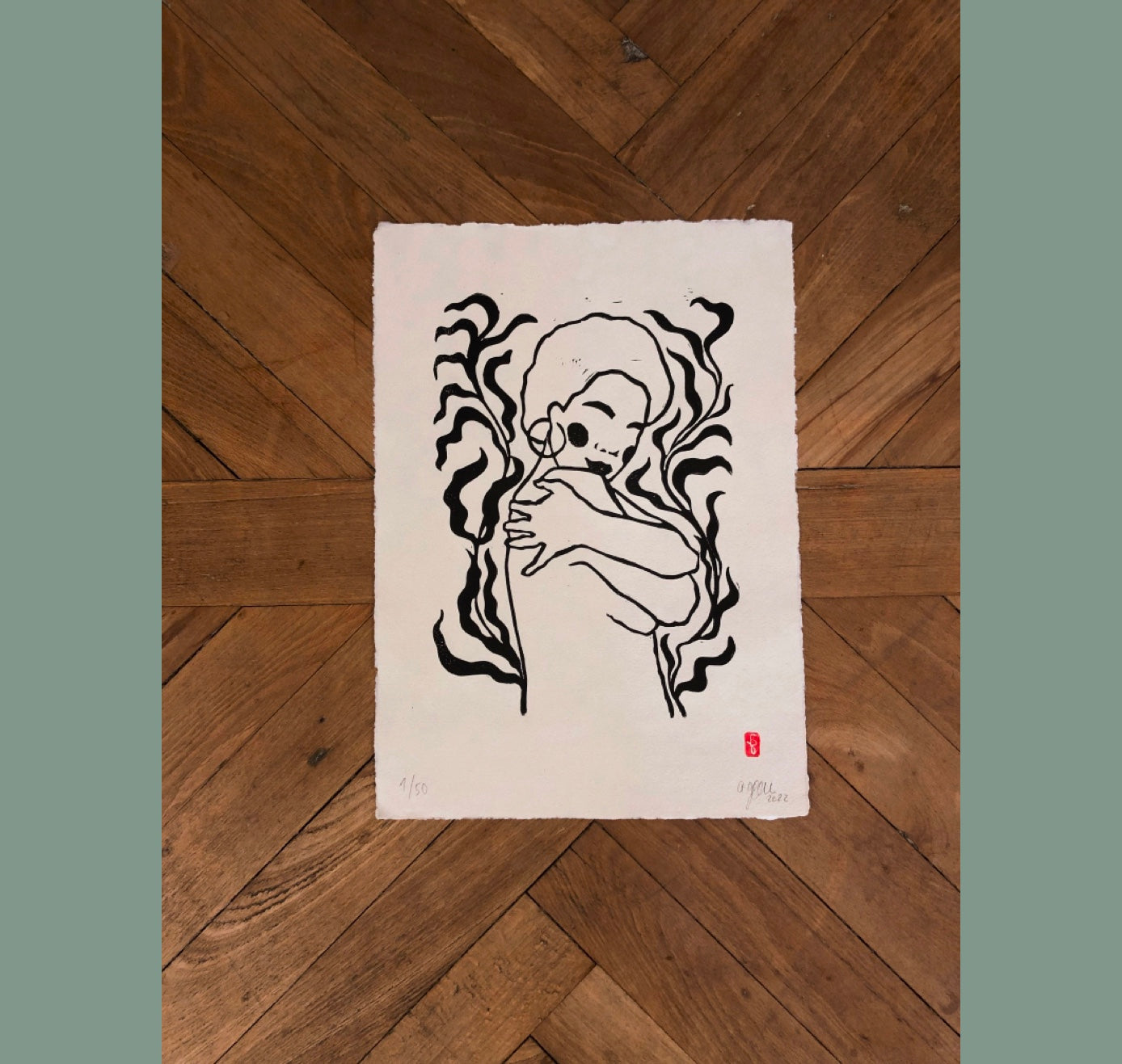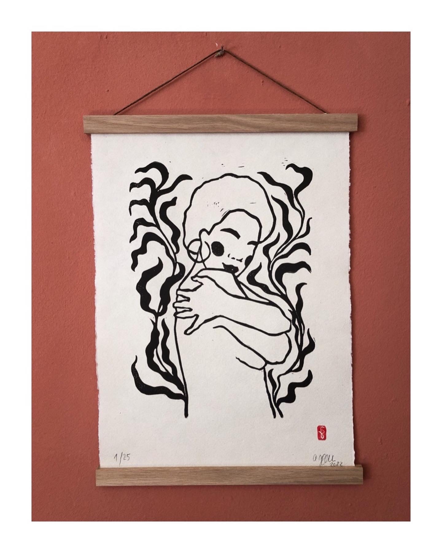 Original A3 Linoldruck ‚Umarmung‘ auf Büttenpapier